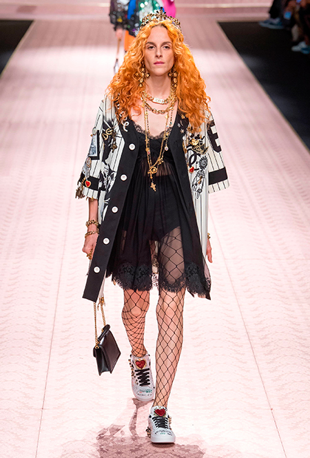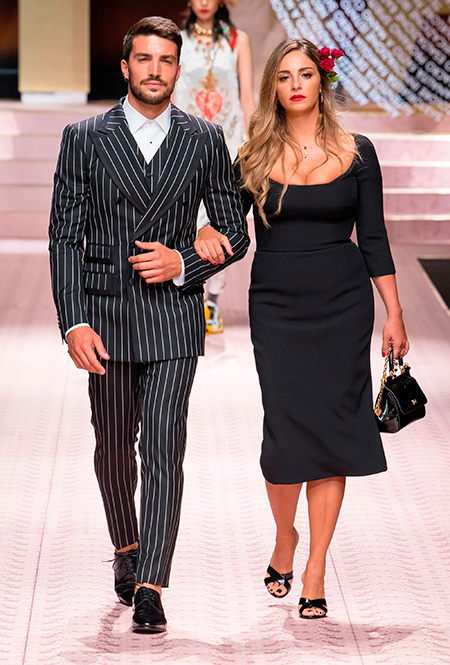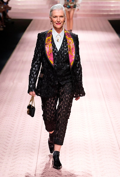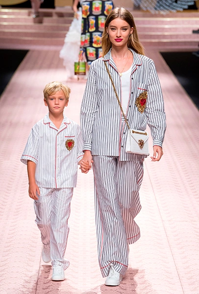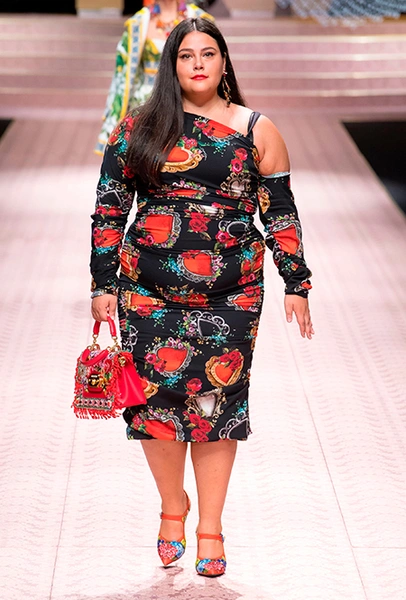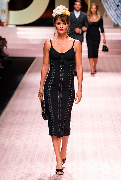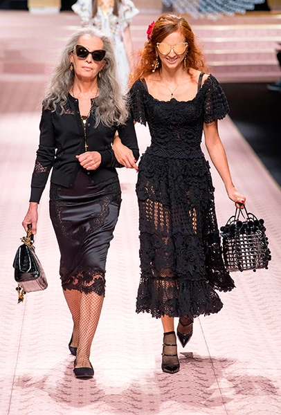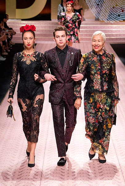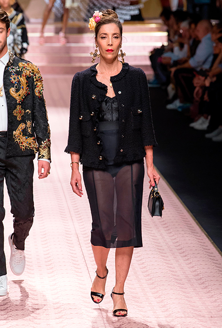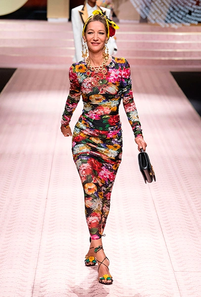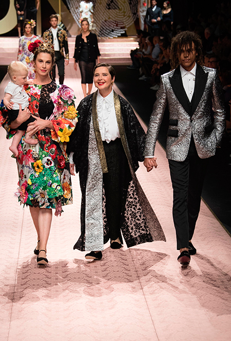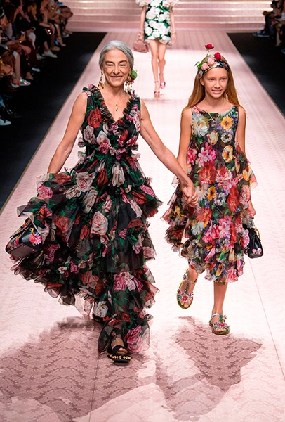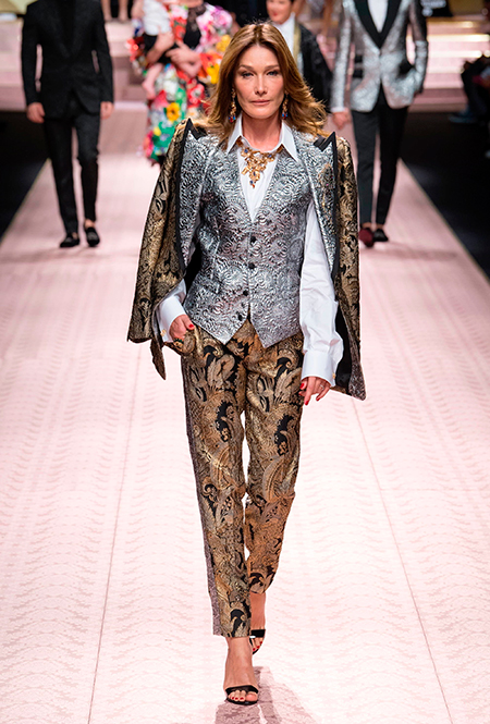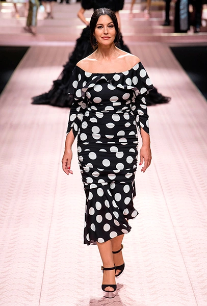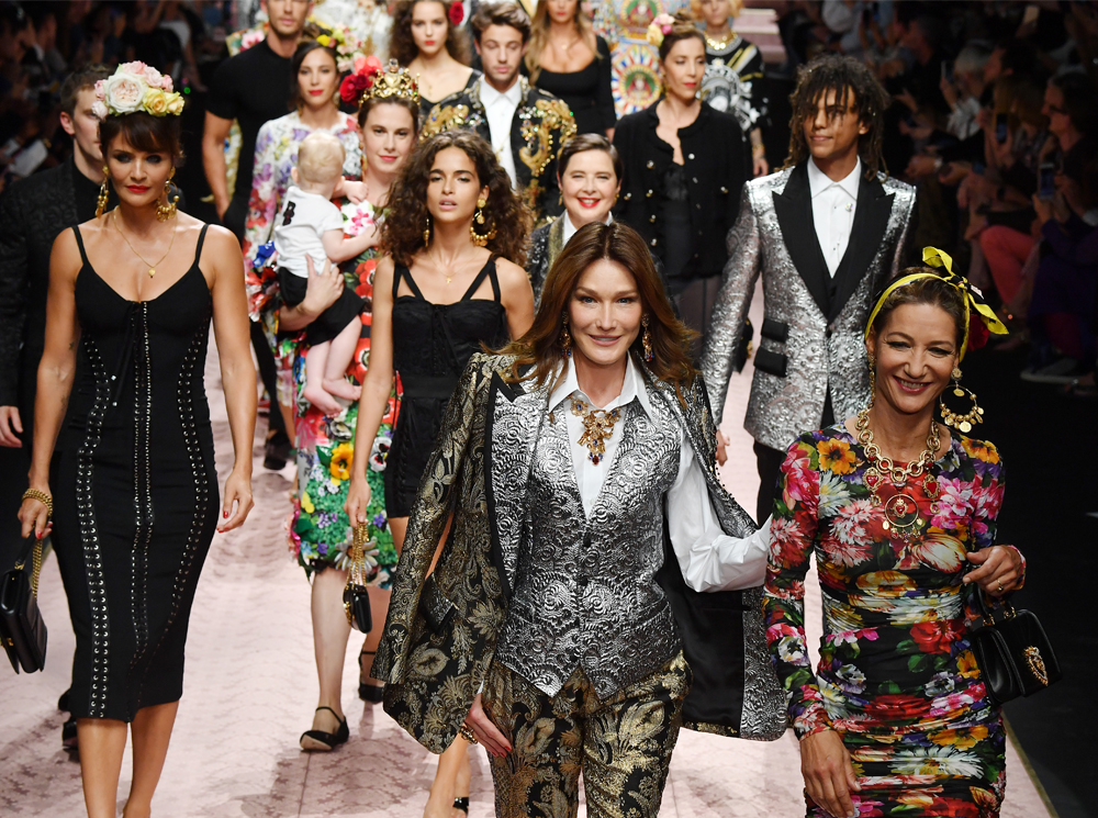 Главные приверженцы семейных ценностей в моде представили настоящее многообразие возрастов и форм, тем самым в очередной раз показывая, насколько разные и по-своему красивые клиенты модного бренда. На подиум инклюзивного шоу итальянцы вывели небывалый звездный состав: и 53-летняя актриса и бессменная муза бренда Моника Беллуччи в платье с принтом polka dot, и экс-первая леди Франции, 50-летняя Карла Бруни в серебристом костюме-тройке из парчи, и 66-летняя актриса Изабелла Росселини с детьми и внуком — также в хитах от D&G.