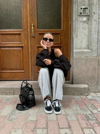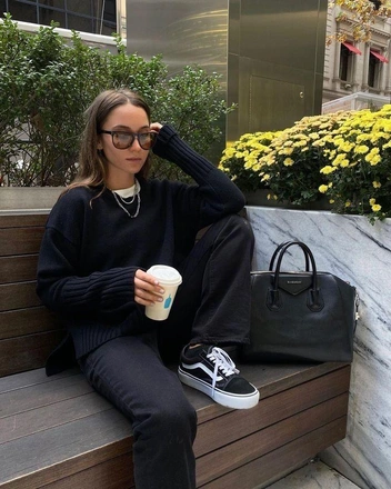 Первый — с повседневной одеждой. Джинсы любимого силуэта или юбка макси, свитер, футболка или худи — и образ готов. Для контраста можно разбавить образ пиджаком с широкой линией плеч.