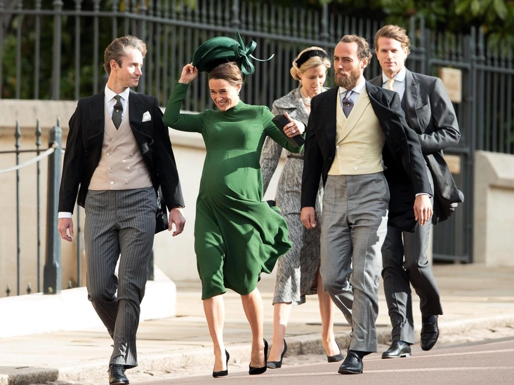 Еще одной гостьей свадьбы принцессы Евгении, которая мечтала поскорее зайти в собор, стала Пиппа Миддлтон. Беременной сестре Кейт Миддлтон пришлось следить за своим платьем от Emilia Wickstead и крупной шляпкой, и все это на лодочках 10 см!