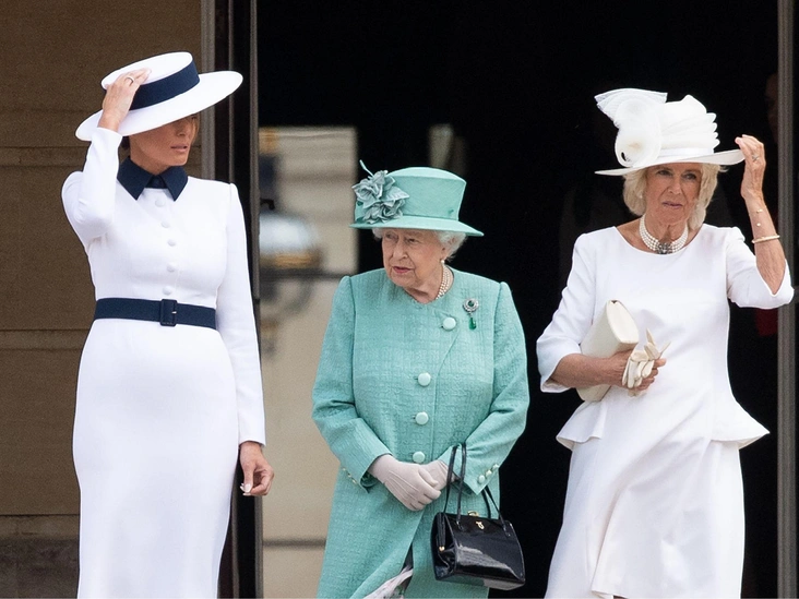 В 2019 году чета Трампов посетила Лондон для встречи с Елизаветой II. Всегда безупречная Мелания соблюла британский протокол и надела сине-белую шляпку, которая идеально подходила к ее наряду. Но не подходила к погоде — так что супруге президента, а также герцогине Камилле, пришлось удерживать дизайнерские головные уборы. К слову, на голове Елизаветы II тоже была шляпка — но та, видимо, не решалась сдвинуться без приказа монарха (читайте также: История королевы Елизаветы II от А до Я: какой мы запомнили главный символ Британии?).