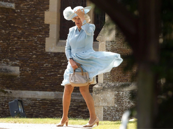 В 2015 году королевская семья прибыла в Сандрингем, чтобы крестить вторую дочь Кейт и Уильяма. В тот день герцогиня Камилла выбрала не очень удачное платье из летящей ткани, которая легко поднялась при дуновении ветра. Но надо сказать, что Камилла попадает с подобные казусы реже других особ Короны.