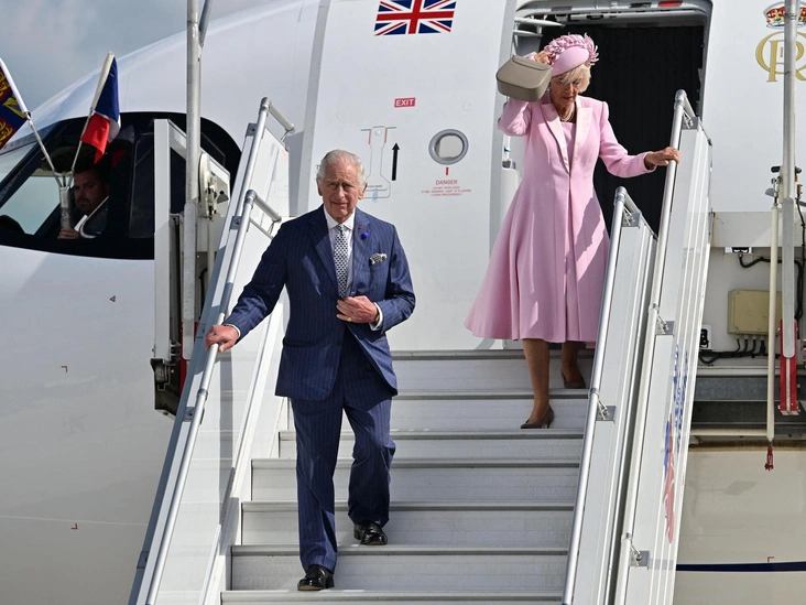 Для своего первого тура в качестве монархов Карл и Камилла выбрали самый романтичный город — Париж. Но при выходе из самолета новая королева Британии была вынуждена придерживать шляпку, чтобы та не улетела обратно в Букингемский дворец. Впрочем, платью Камиллы подобных конфузов удалось избежать.