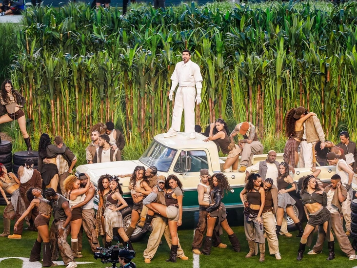 Bad Bunny же пошел по иному пути. Для своего концерта на Супербоуле он выбрал вещи, которые нельзя купить. Причем сделал это крайне необычно для шоу подобного масштаба — кастомный костюм для него сшил не именитый модный Дом, а знакомый всем масс-маркет бренд Zara. Предполагается, что выбор пал на испанский бренд потому, что все его выступление было посвящено испаноязычной латиноамериканской культуре.