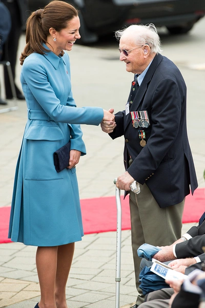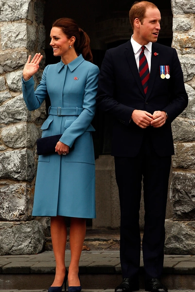 В Бленхейме Кейт Миддлтон и принц Уильям посетили главную достопримечательность – памятник воинам, павшим во время Первой мировой войны. Герцогиня Кембриджская выбрала для официального мероприятия нежно-голубое шерстяное пальто Alexander McQueen с поясом.