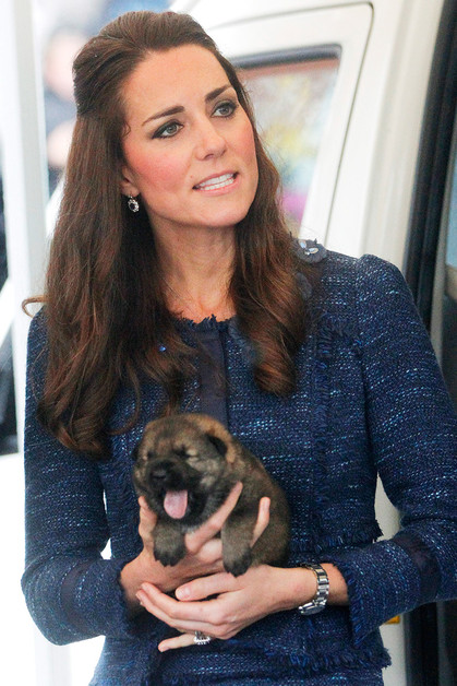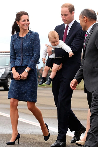 Для последнего дня в Новой Зеландии Кейт выбрала твидовый синий костюм с юбкой-карандашом Rebecca Taylor и лодочки Alexander McQueen. Герцогиня вместе с мужем посетила местный полицейский колледж и почтила память погибших во время дежурства сотрудников. Кейт и Уильяму дали подержать щенков из отряда полицейских собак, которых решили назвать в честь герцога и герцогини.