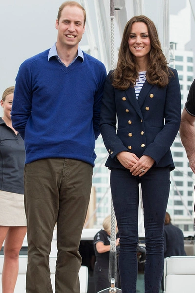 К спортивному клубу Кейт прибыла в полосатом топе ME+EM, темно-синем пиджаке Zara, скинни-джинсах J Brand и обуви на танкетке Russell & Bromley. Во время управления яхтой Кейт сняла блейзер, а на голову надела бейсболку с символикой яхт-клуба и собрала волосы в хвост. Герцогиня защитила глаза от солнца и морских брызг очками Ray Ban.