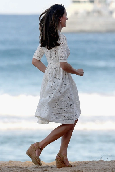 Одним из самых элегантных нарядов Кейт стало белое перфорированное приталенное платье Zimmermann, которое она надела на пасхальную ярмарку и смотр соревнований серферов. Образ герцогиня дополнила босоножками на танкетке любимого бренда Stuart Weitzman и бежевым клатчем L.K. Bennett.
