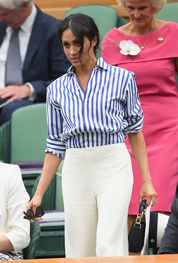 Можно сколько угодно играть в «мою прекрасную леди», надевать шляпки и влезать в платья-чехлы, но у Меган специфическая фигура и пока она на одной волне со своим телом, пока она надевает то, в чем ей комфортно – ее образы прекрасны. Вот именно такой герцогиня Сассекская и была в королевской ложе на Уимблдонском турнире в минувшую субботу. Широкие брюки с высокой посадкой, свободная а-ля мужская рубашка в трендовую вертикальную полоску – и то, и другое из Ralph Lauren Collection сидело на Меган изумительно, подчеркивая и ее хрупкость, и изящество, и ее современное чувство стиля, и ее феминистические взгляды одновременно.