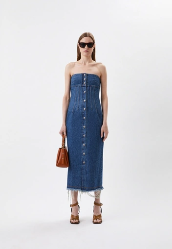 Открытые плечи — еще один горячий летний тренд, на который нас вдохновили звезды 2000-х. Носить такое открытое платье из денима можно классическим способом, то есть на голое тело. Однако самые модные девушки предпочитают экспериментировать со стилизацией: под него они надевают футболки, объемные рубашки базовых оттенков, лонгсливы и бадлоны. В таком случае джинсовое платье напоминает корсет или сарафан, только без бретелей.