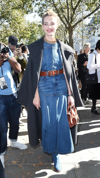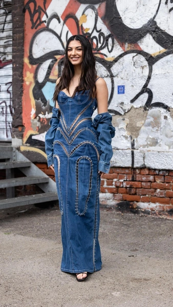 С чем носить такое платье? Поддаться можно тренду на тотал-лук и подобрать к наряду джинсовые туфли или сумку, как часто делают Рита Ора или Дженнифер Лопес. Но эффектно платье будет смотреться и с кожей. Последуйте примеру Натальи Водяновой и подчеркните аутфит черным или коричневым кожаным ремнем, что гармонично перекликается с обувью и аксессуарами.