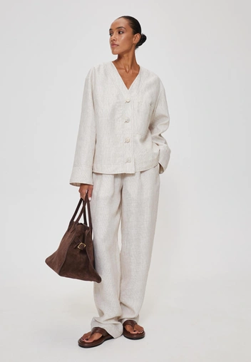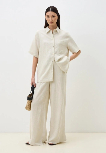 Если хочется добавить образу с брючным костюмом легкости, то рассмотрите открытую обувь. Как вариант — вьетнамки на небольшом каблуке в одном из классических цветов, которые снизят градус серьезности. Что касается ткани костюма, лучше рассмотреть летние варианты по типу льна, поскольку плотная костюмная ткань будет смотреться негармонично с вьетнамками. В финале образа — сумка из мягкой ткани, идеальная для офиса.