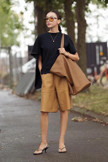 Для тех, кто любит более свободные и легкие одеяния, особенно в теплое время года, придется по душе рубашка оверсайз. В данном случае также можно фантазировать со всевозможными оттенками и подбирать их под конкретную ситуацию. В офис, например, надеть темно-серые или изумрудные бермуды с белым верхом, на прогулку по парку — светлые шорты с салатовой или ярко-розовой рубашкой. Помимо обуви на плоской подошве образ удачно дополнят туфли на невысоком каблуке. Jil Sander также рекомендует присмотреться к смелым бермудам анималистических принтов: в таком случае однотонный верх уравновешивает образ (читайте также: Секреты безупречного стиля Кейт Миддлтон).