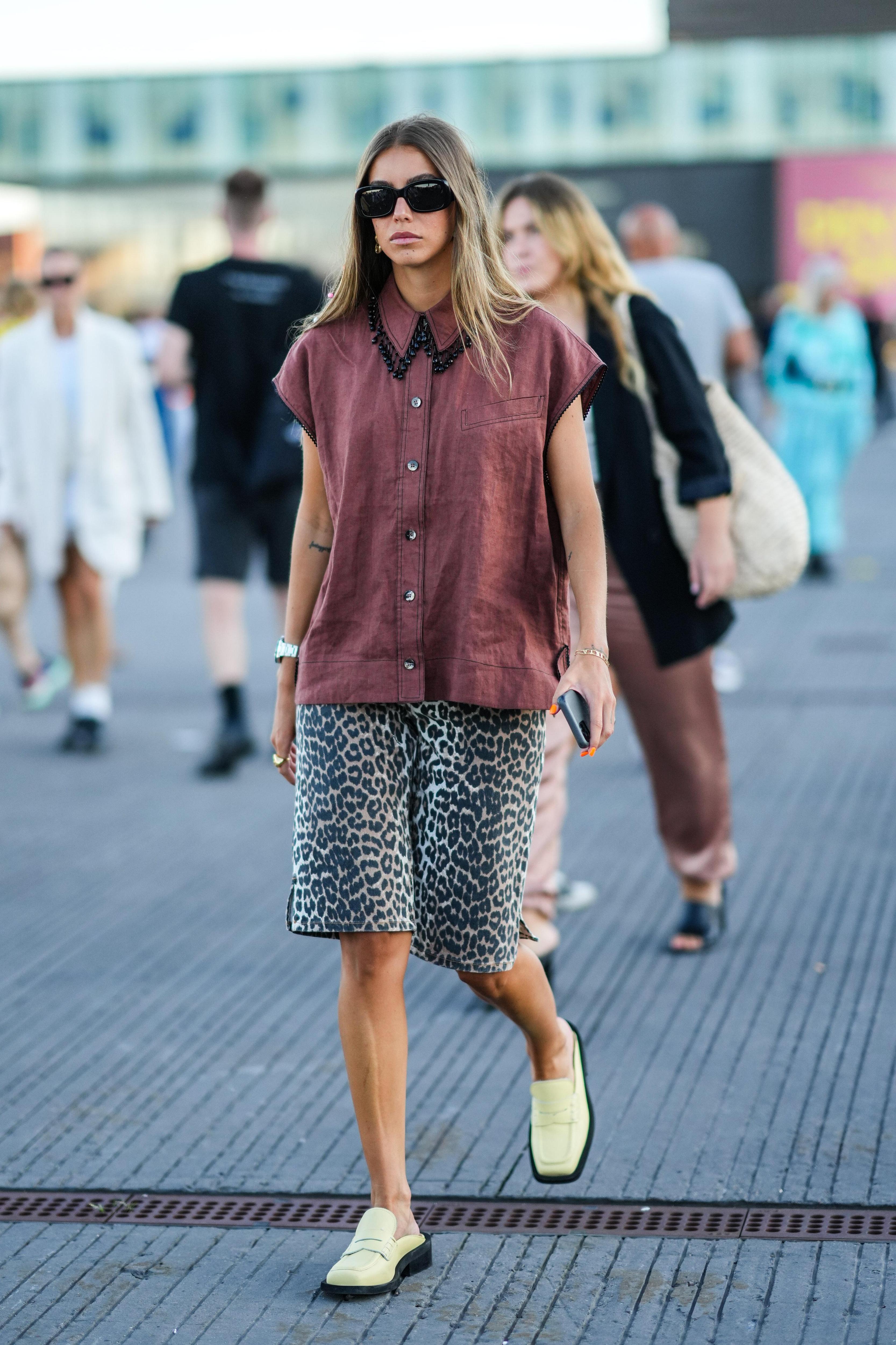 Для тех, кто любит более свободные и легкие одеяния, особенно в теплое время года, придется по душе рубашка оверсайз. В данном случае также можно фантазировать со всевозможными оттенками и подбирать их под конкретную ситуацию. В офис, например, надеть темно-серые или изумрудные бермуды с белым верхом, на прогулку по парку — светлые шорты с салатовой или ярко-розовой рубашкой. Помимо обуви на плоской подошве образ удачно дополнят туфли на невысоком каблуке. Jil Sander также рекомендует присмотреться к смелым бермудам анималистических принтов: в таком случае однотонный верх уравновешивает образ (читайте также: Секреты безупречного стиля Кейт Миддлтон).