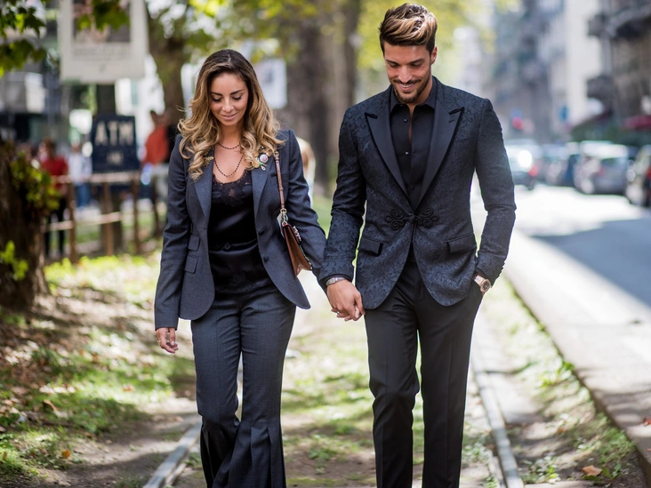 Прежде всего ваши образы должны сочетаться по цвету, ведь именно на него все обращают внимание в первую очередь. Можно выбрать одежду, основываясь на принципе единства, например, синий в качестве преобладающего цвета нарядов у обоих, или на принципе противопоставления, когда мужчина и женщина выбирают контрастные оттенки. В обоих случаях можно легко добиться парности образов. При этом не обязательно облачаться в выбранный оттенок с головы до ног — достаточно, чтобы перекликались основные детали.