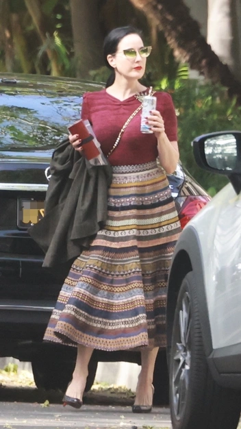 У Диты фон Тиз всегда было свое представление о современном гардеробе. Девушка смогла разработать свой самобытный и узнаваемый стиль. Дита не следит за модой, а предпочитает слушать себя и одеваться так, как нравится ей самой. Но звезде не всегда удается собирать действительно актуальные луки. На этой неделе Дита решила помирить слишком контрастные вещи: фон Тиз надела пеструю юбку длины миди, топ винного оттенка со сборкой у ворота, туфли на каблуке и сумку через плечо на очень длинной цепочке (читайте также: Модные «ведьмы»: звезды, которые не следят за трендами, но всегда выглядят потрясающе).