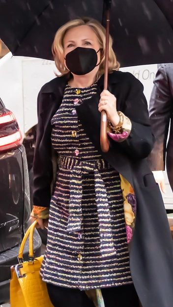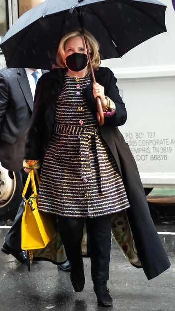 Американский политик, пытаясь спастись от дождя, совершенно забыла о своем образе. Хиллари надела полосатое пальто с поясом на талии, которое похоже больше на платье, черные брюки скинни, а сверху — черный тренч. К и без того неудачному аутфиту Клинтон добавила еще и большую желтую сумку, которой место, разве что, только в компании летних платьев и вещей изо льна.
