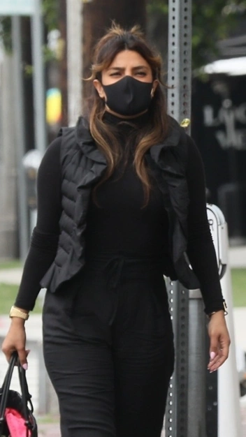 Черный тотал-лук никогда не выглядел так грустно и скучно. Приянка Чопра могла бы получить стильный атуфит, если бы не ошиблась с подбором вещей. Вместо стильных кожаных брюк или черного костюма с мужского плеча, Чопра выбрала широкие брюки на завязках, водолазку и ботильоны на каблуке. Окончательно испортил аутфит жилет с оборками (читайте также: С чем носить черный пиджак: 8 нескучных идей).