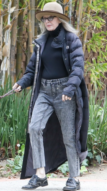 Дайан Китон всегда жила по своим модным правилам. Звезда не следует трендам, но часто добивается стильных и самобытных аутфитов. Но не в этот раз. Выбранные звездой шляпа и оксфорды с контрастной строчкой не вписались в образ с удлиненным пуховиком. Но, с кем не бывает (читайте также: Модные «ведьмы»: звезды, которые не следят за трендами, но всегда выглядят потрясающе).