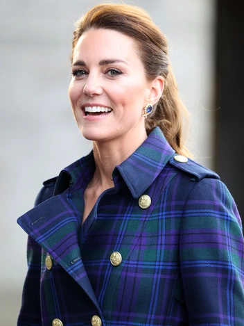 На Кейт был эффектный тренч Holland and Cooper из шерстяной тартановой ткани с двумя рядами пуговиц, ремнем и другими деталями в стиле милитари. Под ним пряталась плиссированная юбка Joseph из мерцающей металлизированной ткани. Дополнили ансамбль изумрудные лодочки Manolo Blahnik и серьги с сапфирами из коллекции Ее Величества, которые видели на Елизавете в 1979 году.