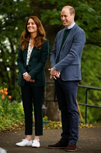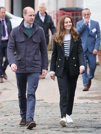 После этого Кембриджские нанесли визит в свою альма-матер, где состоялось их знакомство. Уильям предпочел темно-синюю куртку, повседневные брюки в тон, голубую рубашку, свитер и коричневые ботинки. А вот Кэтрин выглядела немного более непосредственно, совмещая в одном комплекте черный брючный костюм британского производства из тонкой шерсти, полосатый джемпер Erdem из кашемира и белые кеды Veja. В таком виде герцогиня не только прогуливалась по окрестностям вместе со своим мужем, общаясь с местными рыбаками и их семьями, но и сажала деревья.