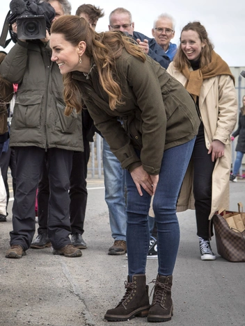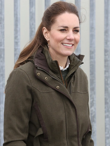 После обеда во второй день визита герцогиня переоделась в более утилитарный комплект. На ней были ее любимые облегающие джинсы, коричневые ботинки на шнуровке и куртка цвета хаки производителя Seeland, специализирующегося на одежде для загородного времяпрепровождения. Похоже, что под непромокаемой курткой с капюшоном прятался тонкий пуховик той же марки, а также деликатная белая блуза в мелкую крапинку с высоким воротником с рюшами. Кроме того, на герцогине была маска Amaia Kids с другим цветочным рисунком.
