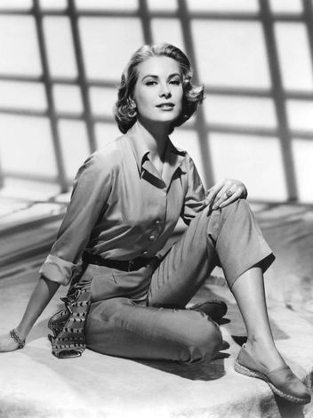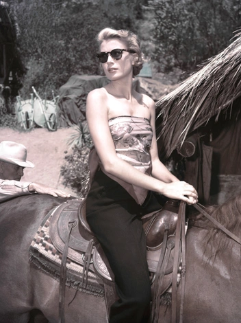 С подачи мисс Келли верховая езда внезапно стала выглядеть намного шикарнее, чем мы привыкли. На этих снимках актриса запечатлена во время съемок в фильме «Могамбо» — в темных брюках, шелковом платке, выступившем в роли топа, и стильных солнечных очках.