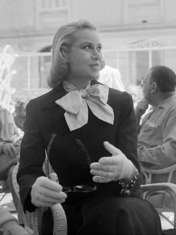 В апреле 1955 года актриса прибыла во Францию на Каннский фестиваль. Именно там звезда и познакомилась со своим будущим мужем. Здесь Грейс запечатлена в черном костюме, блузе с «кошачьим» бантом и белых перчатках.