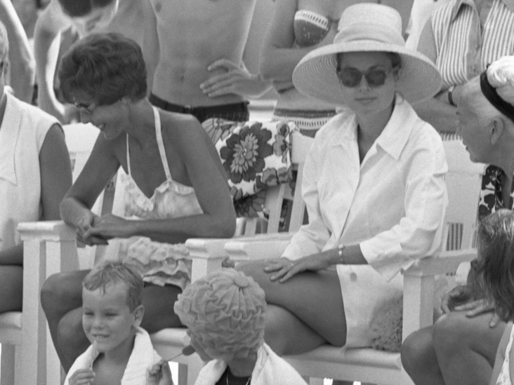 А это редкий снимок беременной княгини. Она наблюдает за соревнованием по плаванию в Монако вместе с семилетней дочерью Каролиной и шестилетним сыном Альбером, находясь в ожидании третьего ребенка. На Грейс белая рубашка, солнечные очки и эффектная соломенная шляпа в стиле 1960-х.