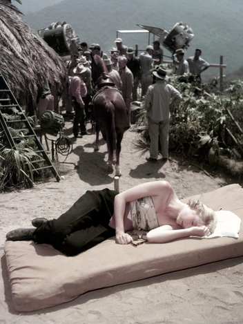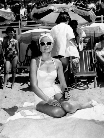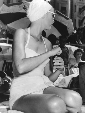 А здесь кинозвезда запечатлена на пляжном полотенце среди шезлонгов и зонтиков на Лазурном берегу. Грейс играет роль богатой наследницы Фрэнсис Стивенс в фильме Альфреда Хичкока «Поймать вора». На ней купальный костюм, солнечные очки и головной убор от солнца.