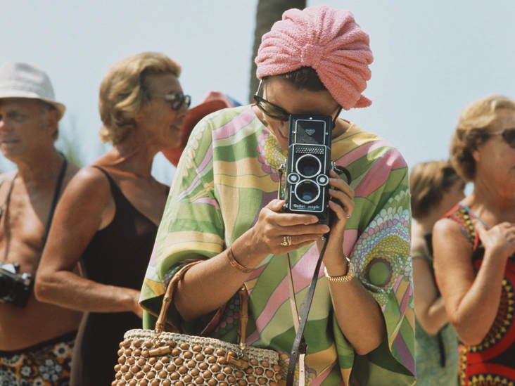 Ну а этот пляжный снимок демонстрирует моду 1970-х. На княгине Монако, которая фотографирует соревнования по плаванию в Монте-Карло, платье с жизнерадостным принтом, солнечные очки и махровый головной убор. Ансамбль дополняет сумка на бамбуковых ручках.