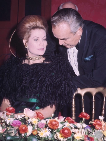 С возрастом в стиле Грейс стало больше драматизма. Княгиня полюбила объемные прически и броский декор вечерних ансамблей. Здесь они с князем Ренье запечатлены на государственной вечеринке в Монако.