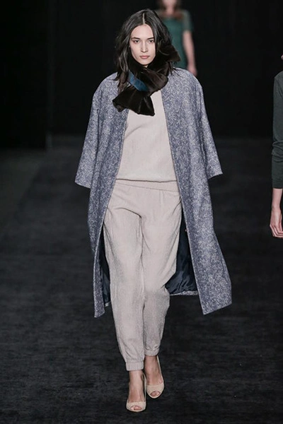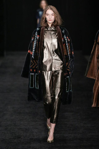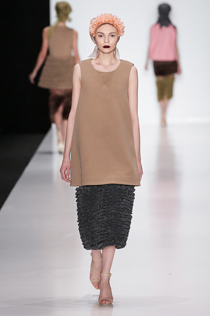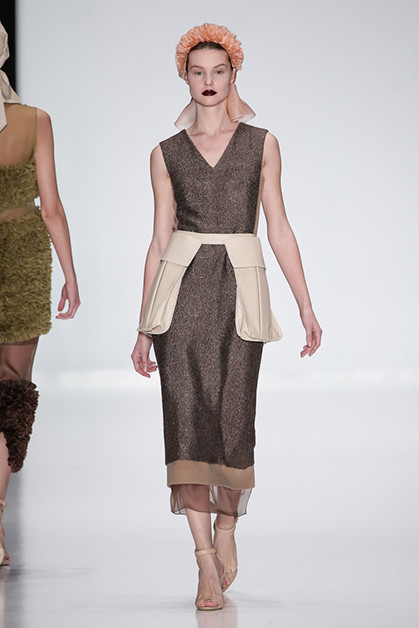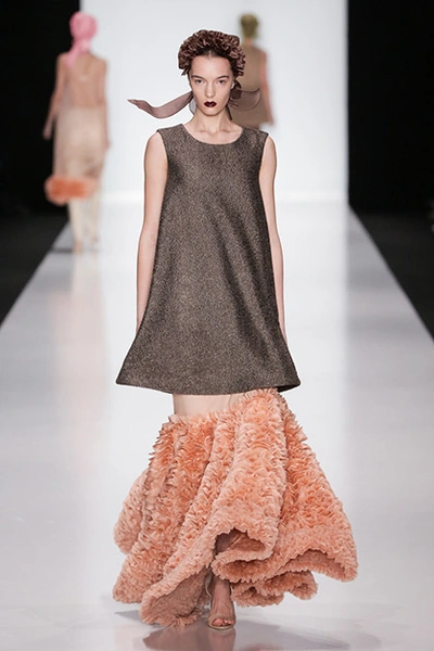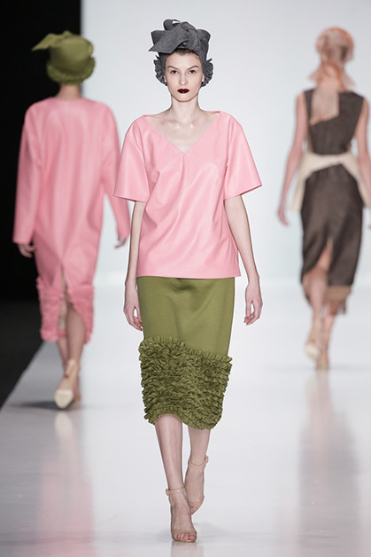 Сестры Рубан стали известными благодаря пальто и талантливой работе с кожей. Этим они и продолжают заниматься, но новая коллекция стала, пожалуй, самой смелой из всех предыдущих. Рубан отдали дань всеобщему тренду – пальто с меховыми карманами. Две другие магистральные идеи – многоярусность и мелкие рюши из органзы. Особенного внимания заслуживают цветовые сочетания: серый с бледно-оранжевым, розовый с зеленым.