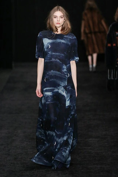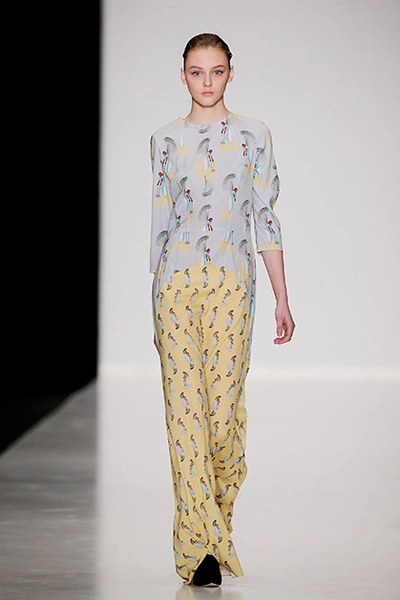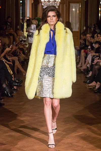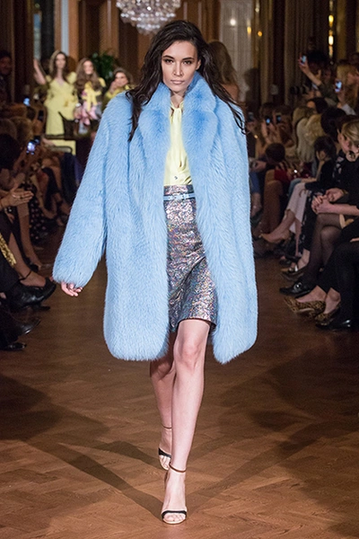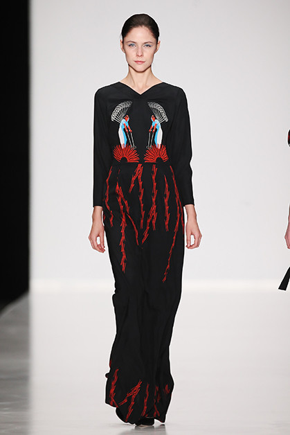 Можно сказать, что героиня сказочницы Алены Ахмадуллиной повзрослела, но без фантастических сюжетов не обошлось – эта одежда посвящена новелле Оскара Уайлда «Кентервильское привидение». Отсюда элементы английских костюмов конца XIX века. Наши фавориты – шубы с узорами из разноцветного меха, серые пальто и платье в пол с «ночным» принтом.