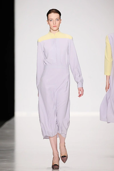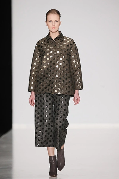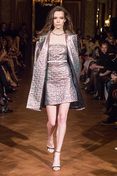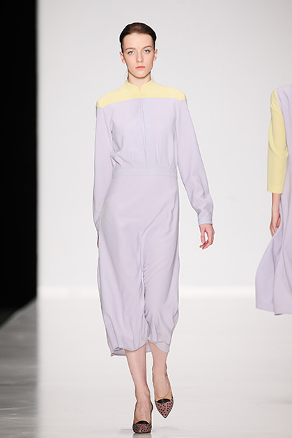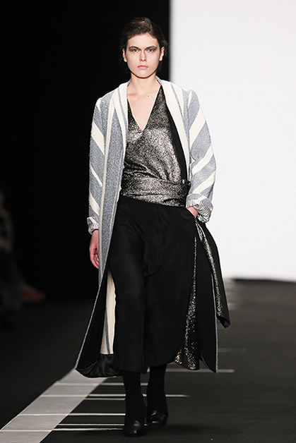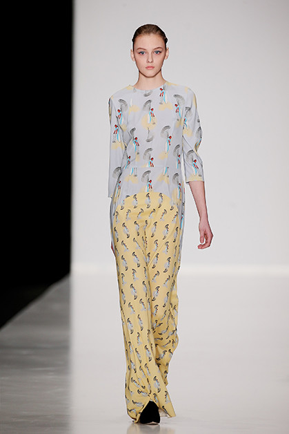 Украинская мода сейчас, безусловно, в расцвете. Еще одну украинку, Лилию Пустовит, прославили шелковые платья. В этой коллекции они карамельных цветов, графичные, с черными вставками или с ретропринтами в виде лыжниц. Они сочетаются с корсетами, жакетами и со свитшотом (это сочетание стало уже почти классическим). Самая запоминающаяся вещь – серое пальто с металлизированными горошинами.