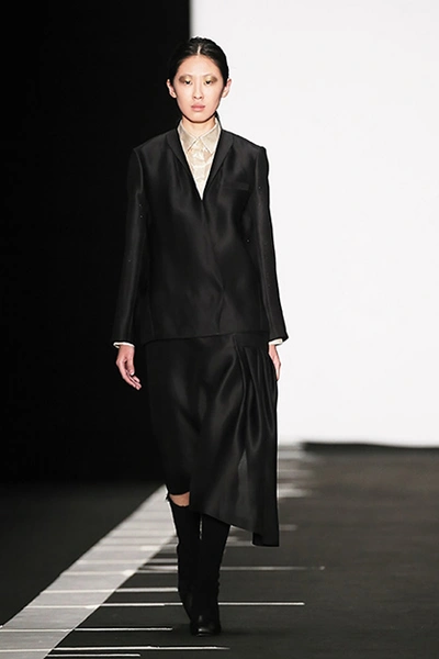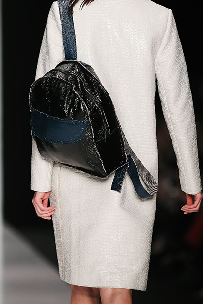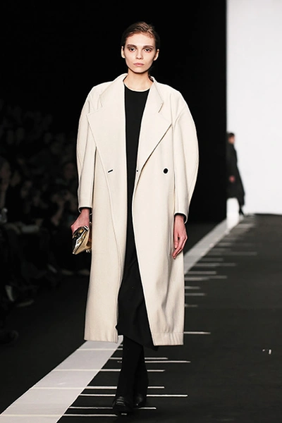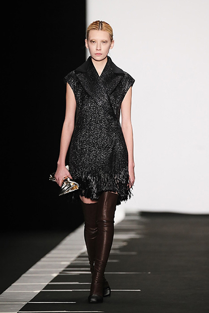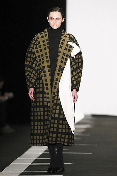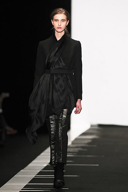 Дизайн украинки Лилии Литковской принято считать архитектурным, скульптурным, а ее саму – минималистом. Хотя мне лично ее минимализм кажется довольно умеренным. В ее новой коллекции и накидки, и шарфы, и бантики сбоку. Скульптурность достигается благодаря материалам – тисненой коже и винилу. Другая любимая тема дизайнера – объемные и прямые длинные пальто с широкими рукавами; это конец 80-х, если бы были «плечи». Заметно влияние Японии – в этом запахе, в широких поясах.