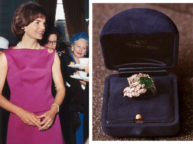 Элегантная красавица Жаклин Бувье (в будущем Кеннеди) получила предложение руки и сердца по телеграфу от завидного жениха. Кольцо, которое преподнес Джон Кеннеди было от ювелирного дома Van Cleef & Arpels. Это было первое ювелирное украшение в жизни девушки, так как в тот момент она работала в издании The Washington Times и получала порядка 50 долларов в неделю. Интересно, что будущий супруг выбрал подарок в стиле «Ты и Я», где в центре красуются бриллиант с изумрудом, окруженные веточками с бриллиантами.