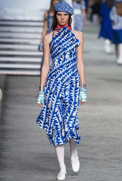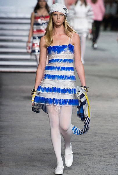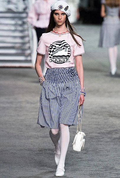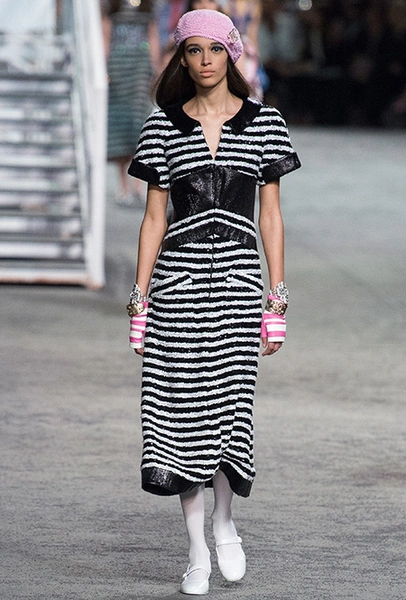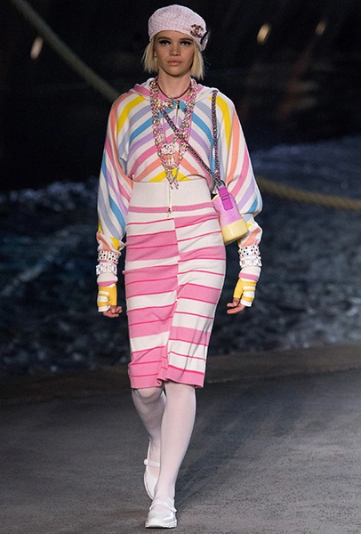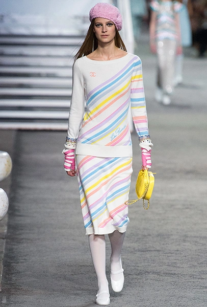 Полосатых вещей в новой круизной коллекции было действительно много. Располосованными оказались и прямые брюки на высокой талии, и юбки, и свитшоты, и платья. Полоска была разной: бело-синяя, явно намекавшая на морскую тему коллекции, соседствовала с конфетными оттенками розового, желтого и фиолетового.