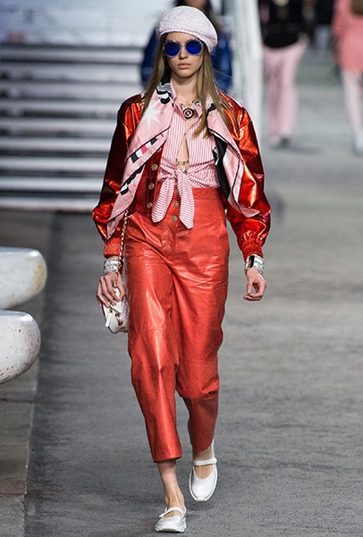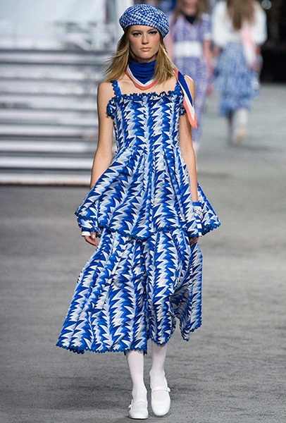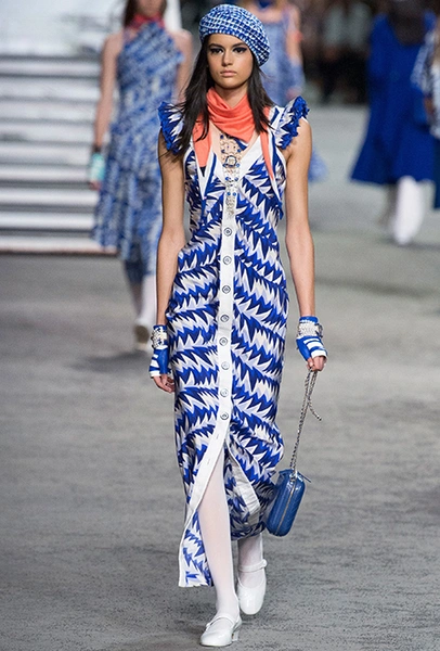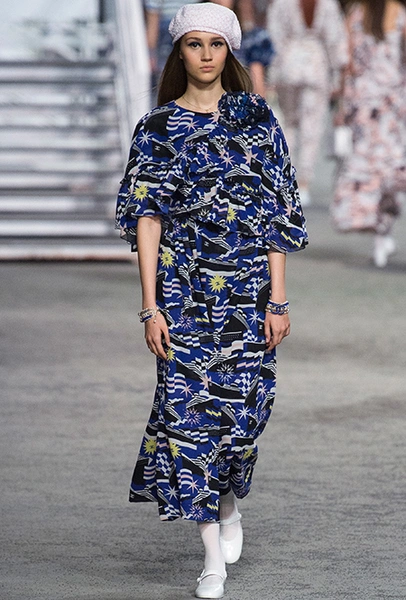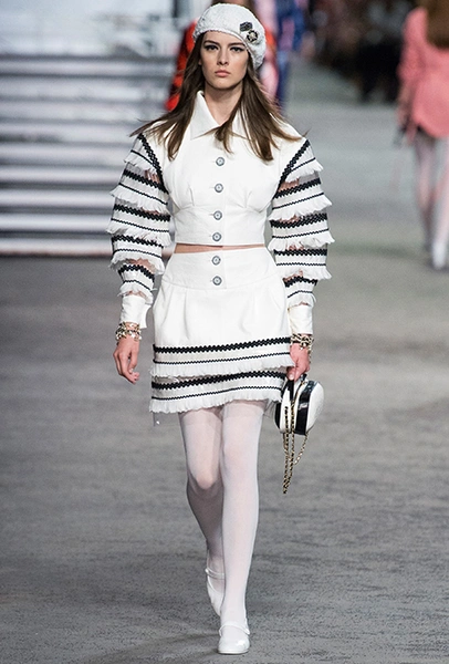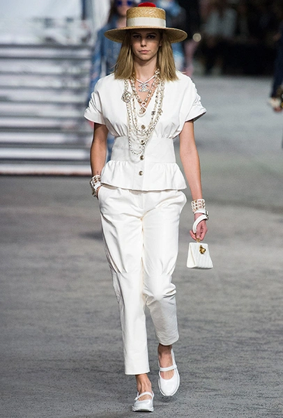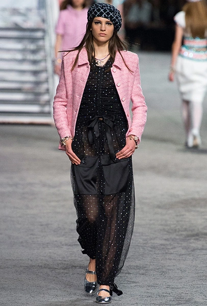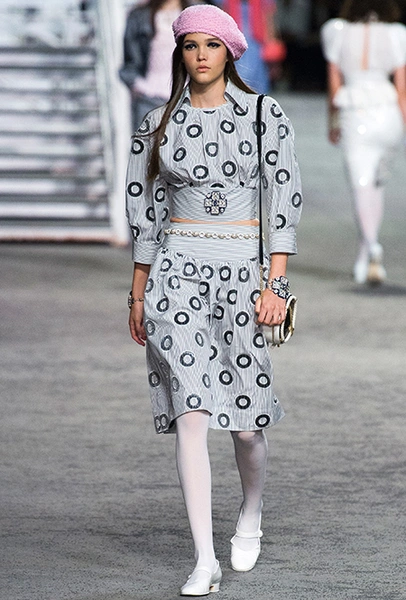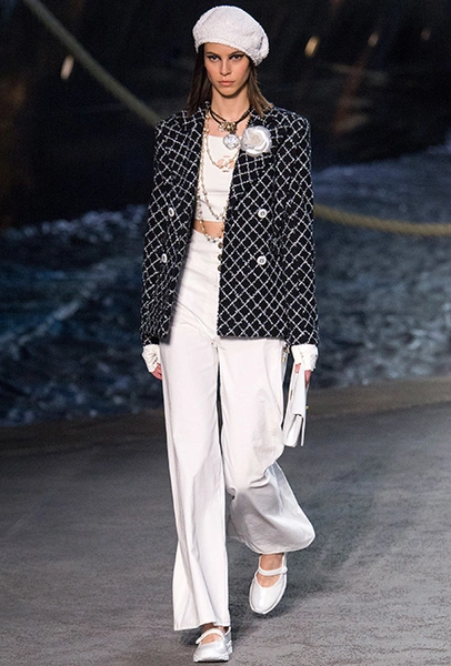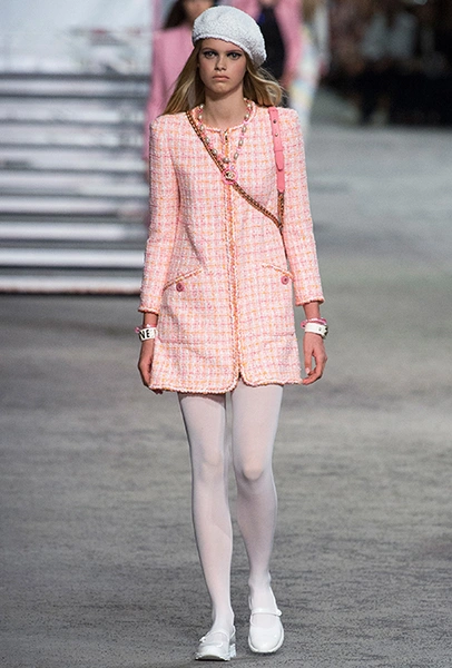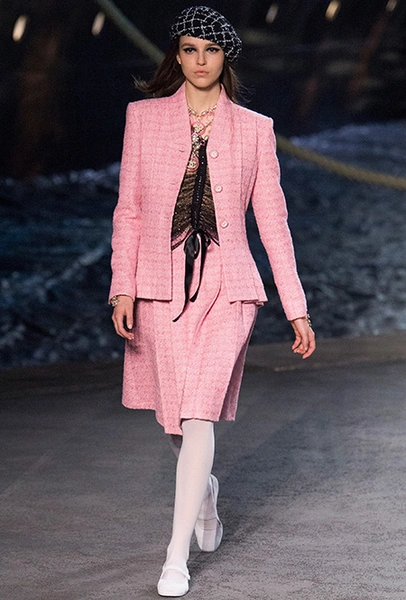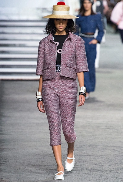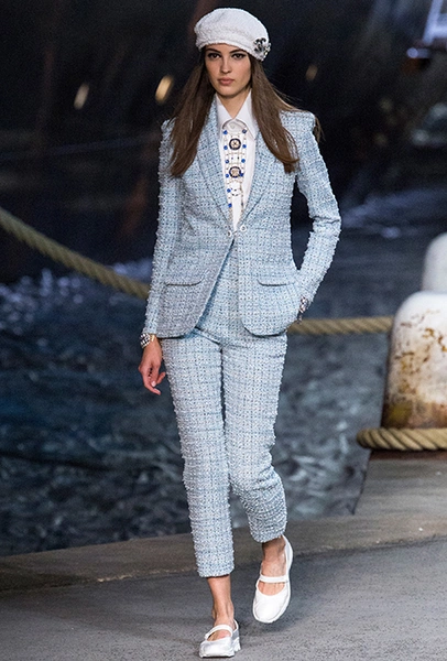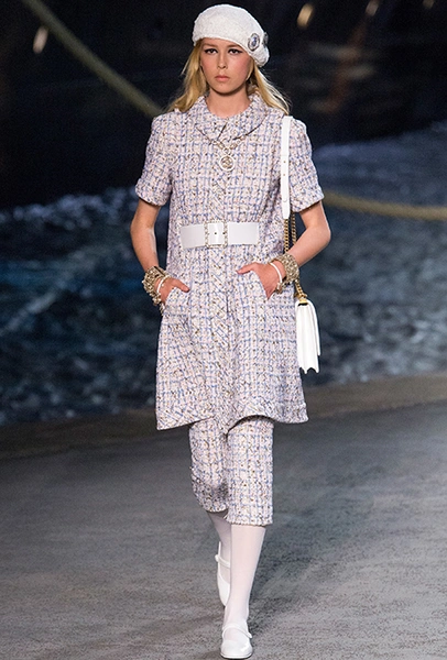 Под левым бортом исполинской декорации был выстроен подиум, где модный кайзер и показал сразу 88 новых образов. Среди них — привычные вариации на тему твидового костюма, а также двубортные жакеты, плиссированные юбки и разномастные платья — в общем, все то, что понадобится путешественнице в теплых странах следующей зимой. Как обычно, коллекция поступит в продажу только осенью, но некоторые ее идеи можно воплотить уже этим летом. Зачем ждать?