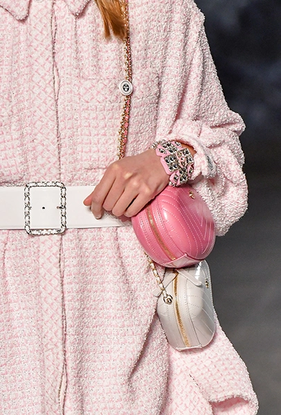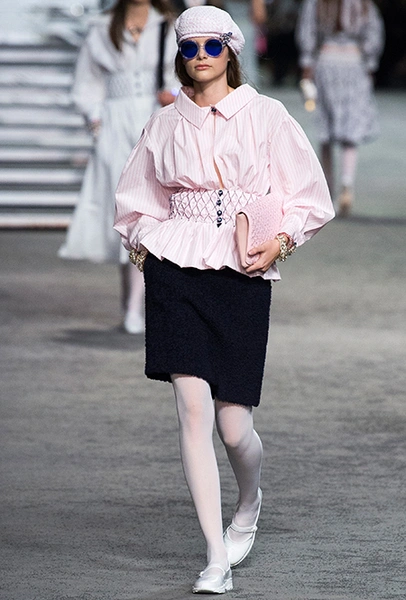 Два месяца спустя свой вариант акцента на талии представляет Карл Лагерфельд. У дизайнера пояса играют роль и самостоятельного аксессуара, и составного элемента твидовых платьев, выступая наружу лишь спереди.