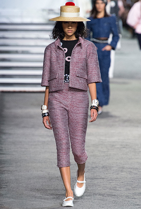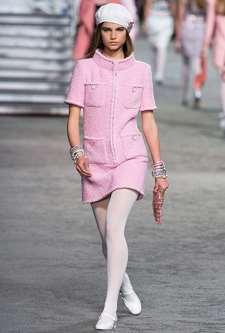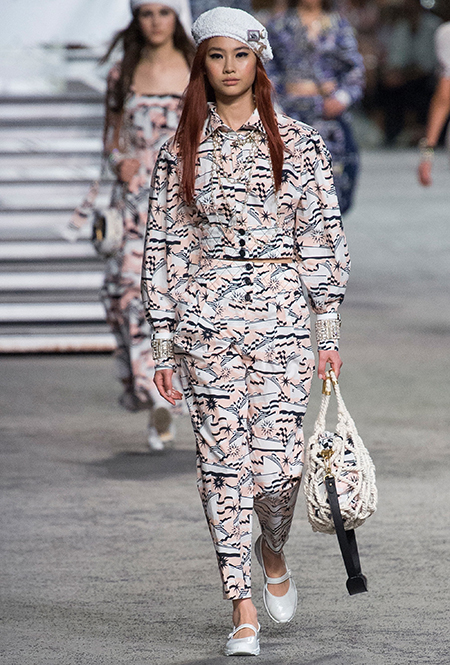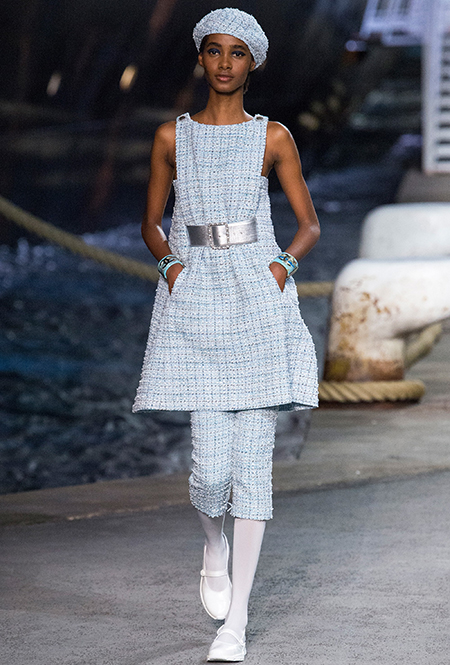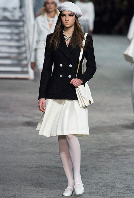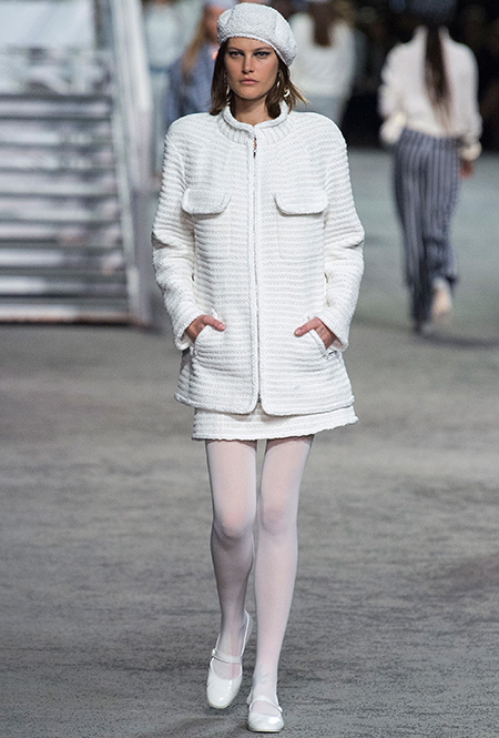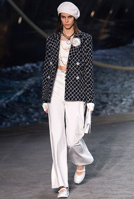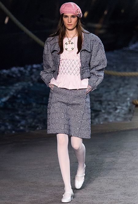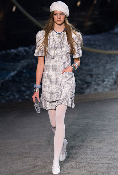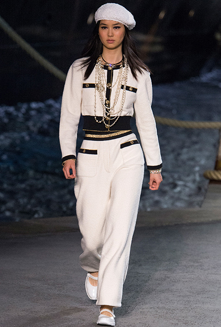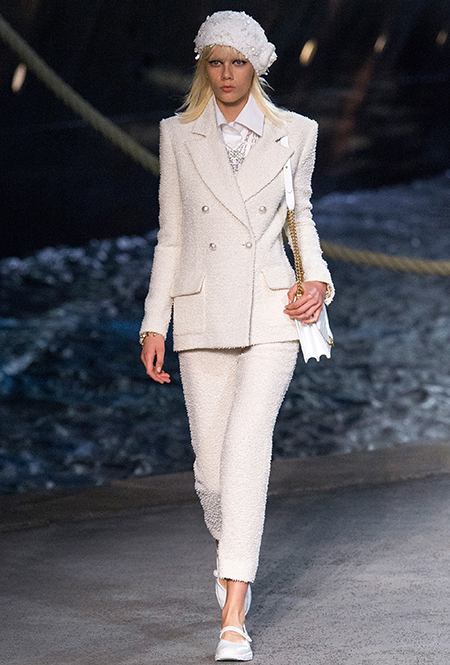 Под левым бортом исполинской декорации был выстроен подиум, где модный кайзер и показал сразу 88 новых образов. Среди них — привычные вариации на тему твидового костюма, а также двубортные жакеты, плиссированные юбки и разномастные платья — в общем, все то, что понадобится путешественнице в теплых странах следующей зимой. Как обычно, коллекция поступит в продажу только осенью, но некоторые ее идеи можно воплотить уже этим летом. Зачем ждать?