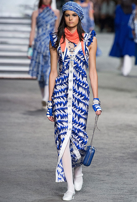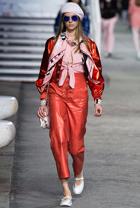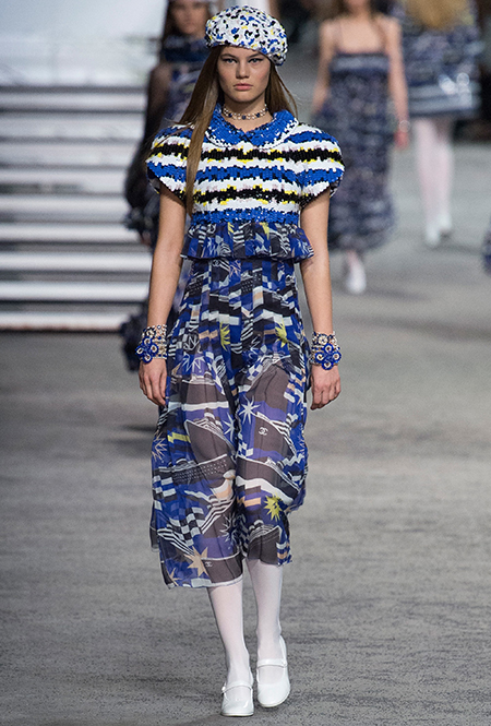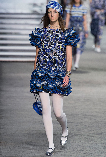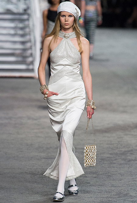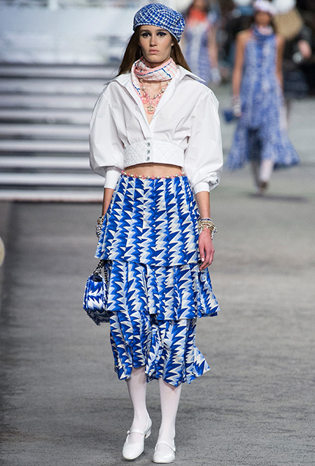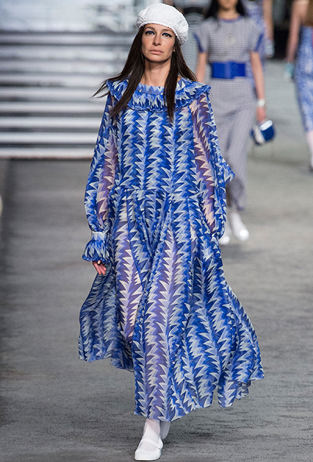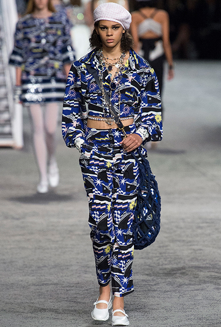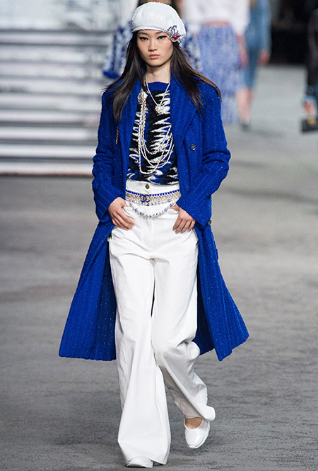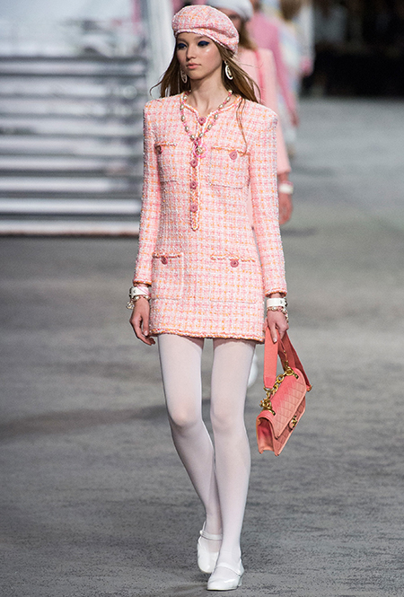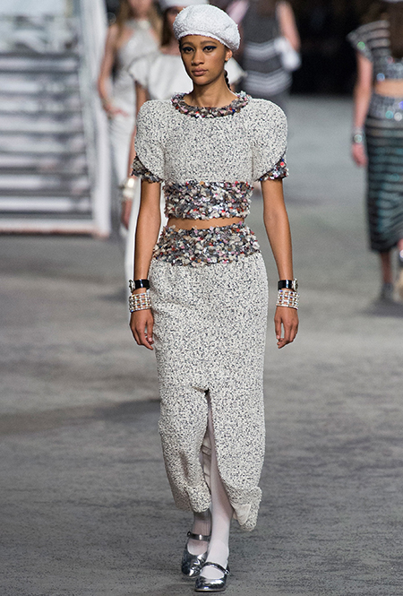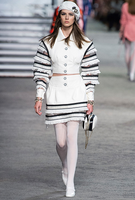 Под левым бортом исполинской декорации был выстроен подиум, где модный кайзер и показал сразу 88 новых образов. Среди них — привычные вариации на тему твидового костюма, а также двубортные жакеты, плиссированные юбки и разномастные платья — в общем, все то, что понадобится путешественнице в теплых странах следующей зимой. Как обычно, коллекция поступит в продажу только осенью, но некоторые ее идеи можно воплотить уже этим летом. Зачем ждать?