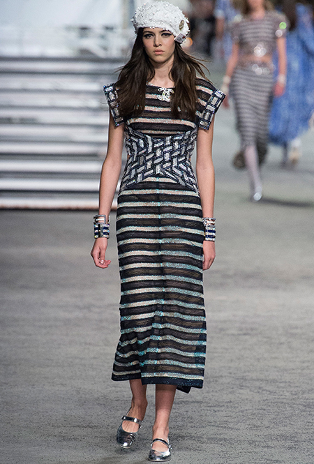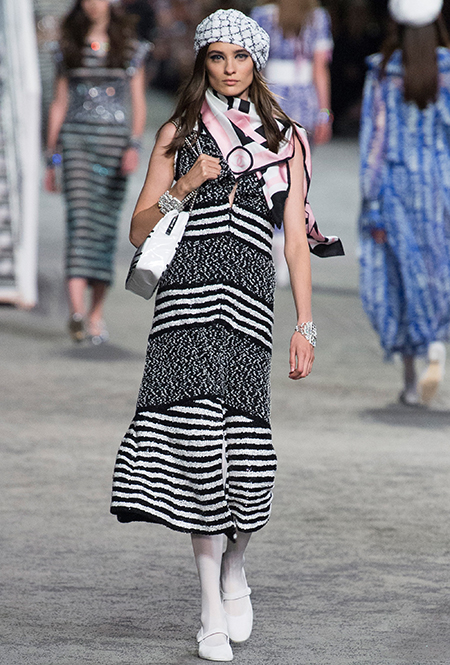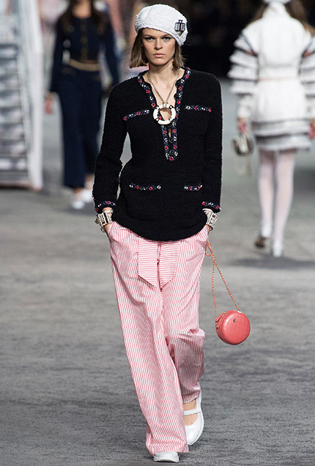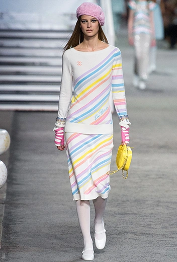 Полосатых вещей в новой круизной коллекции было действительно много. Располосованными оказались и прямые брюки на высокой талии, и юбки, и свитшоты, и платья. Полоска была разной: бело-синяя, явно намекавшая на морскую тему коллекции, соседствовала с конфетными оттенками розового, желтого и фиолетового.