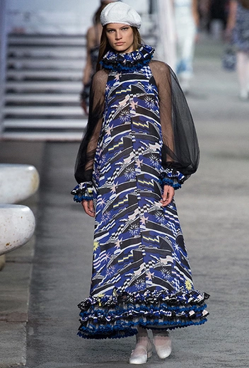 Сама по себе идея с невесомыми прозрачными фактурами не нова, но ее интерпретация Лагерфельдом интересна: разукрашенная юбка и черные пышные рукава отлично дополняют и без того сложные платья, появившиеся на подиуме под занавес всего показа.