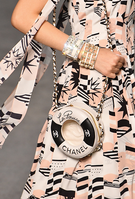 На этот раз лейтмотивом аксессуарной моды стал спасательный круг: это средство спасения утопающих трансформируется в кулон (если его можно так назвать), браслеты и даже круглую сумку. Последней предсказываем колоссальный успех: за коллекционными сумками от Chanel ведется самая настоящая охота.
