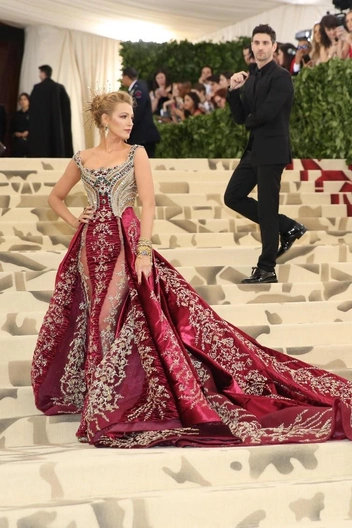 Постаралась над католической символикой — тема звучала как «связь моды и католицизма» — и Блейк Лайвли. Актриса появилась в роскошном малиновом платье от Versace с узорной вышивкой, инкрустированном драгоценными камнями лифом и очень длинным шлейфом. Внешне оно напоминало праздничное облачение священника, а голову звезды венчал нимб, закрепленный в волосах.