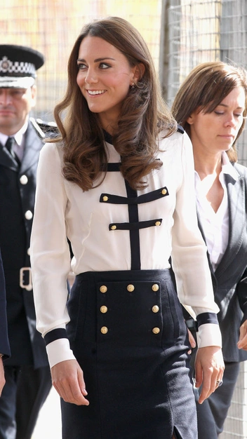 Еще одна долгоиграющая вещь в гардеробе Кейт — блузка в стиле милитари от одного из любимых люксовых брендов герцогини Alexander McQueen. В ноябре она надевала белую блузку с крупными золотыми пуговицами для посещения лондонского Имперского военного музея. Но свой первый выход эта вещь получила еще в 2011 году, во время поездки герцогини в Бирмингем.