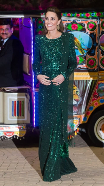 По несколько раз Кембриджская надевает и вечерние платья. И одно из ее любимых — блестящее изумрудное платье в пол от Jenny Packham. Впервые Кейт надела его в 2019 году во время официального тура в Пакистан. А в минувшем ноябре появилась в том же наряде на представлении Royal Variety Performance в Альберт-холле.