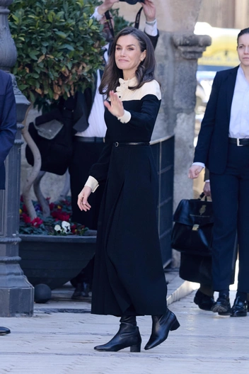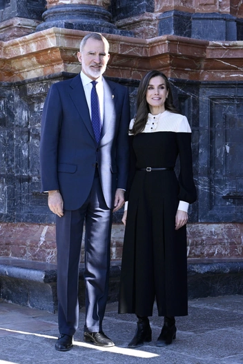 В испанском Каравака-де-ла-Крус каждые семь лет объявляют юбилейный год — по этому случаю королева Летиция и король Филипп нанесли визит местным жителям. Монарх выбрала нестандартный для себя образ с черно-белым комбинезоном с акцентом на поясе. В завершении аутфита — ботильоны на устойчивом каблуке с квадратным мысом (намек на ретро-стиль — это тренд 2025 года).