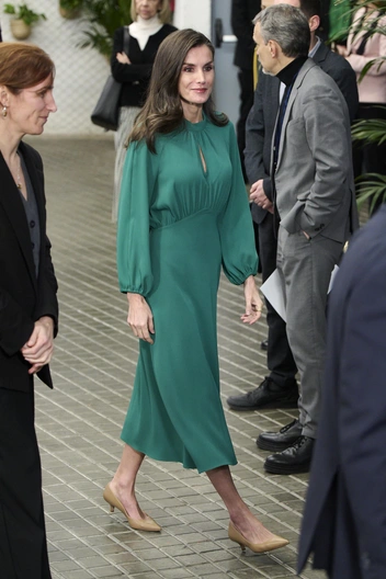 Туфли на каблуке kitten heels давно стали частью гардероба королевы Летиции. Это модно, а еще в прошлом году монарх рассказала о проблемах со здоровьем ног — так что берем на заметку, если тоже хочется снизить нагрузку на стопы. На этот раз Летиция предпочла бежевые из кожи, на фоне которых изумрудное платье смотрелось еще ярче.