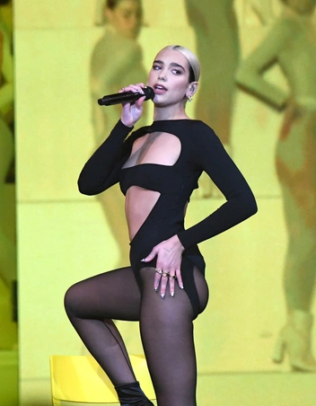 Сцена — место, где Дуа добилась наибольших успехов. Причем не только благодаря своему голосу, но и потрясающим нарядам, которые запоминаются даже тем, кто еще не стал поклонником вокала певицы. Здесь звезде и ее гардеробной фее Лоренцо можно экспериментировать без ограничений: платье с кристаллами в стиле эпохи ревущих 20-х от Miu Miu, фантастическая накидка от Versace, под которой скрывается сверкающий бельевой комплект, или откровенное ярко-красное боди с черными колготками.